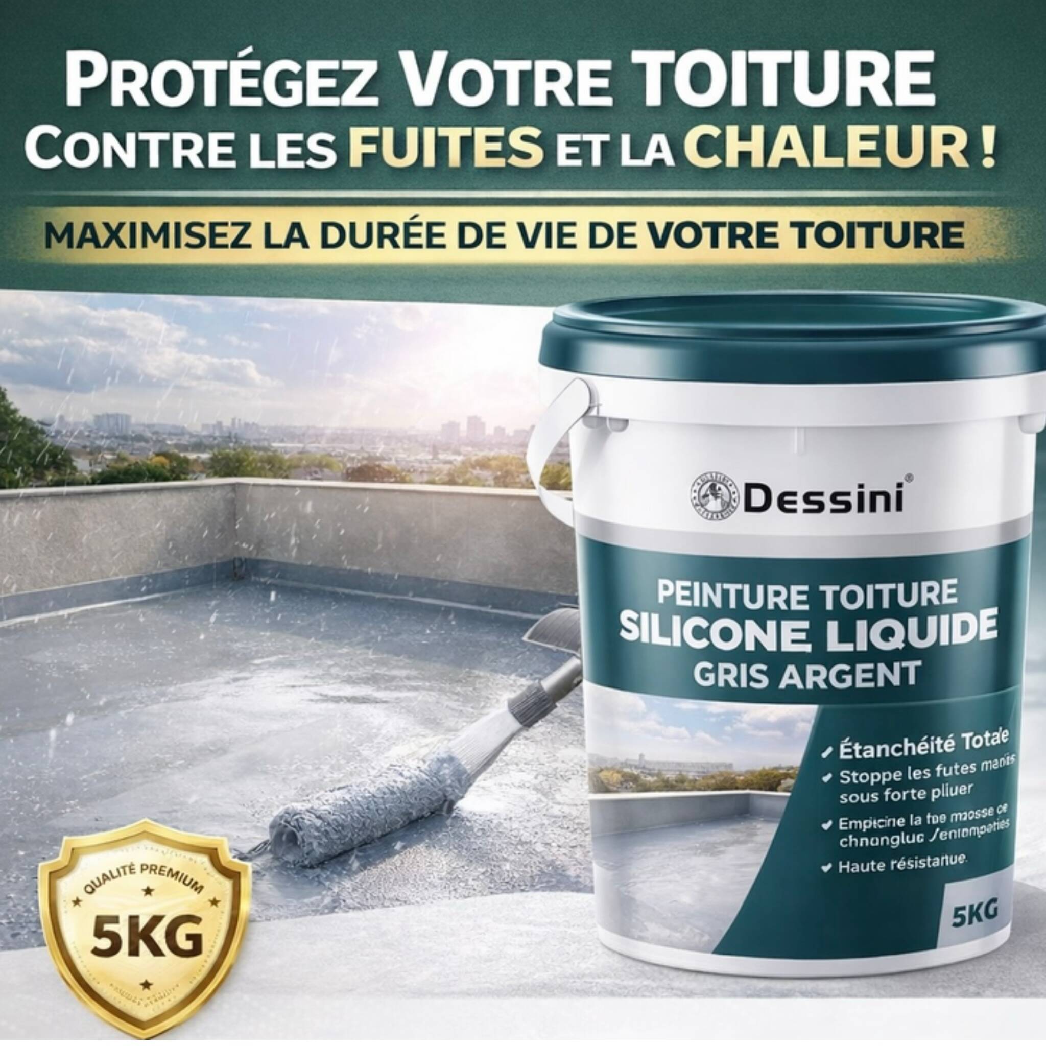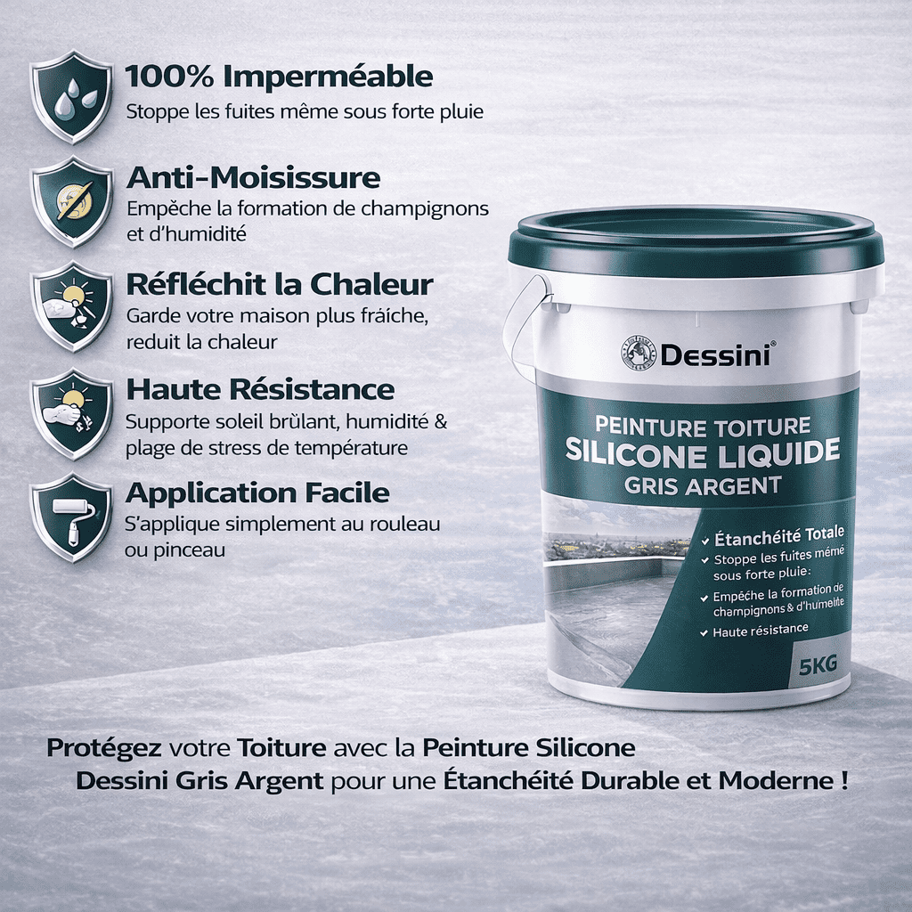 La peinture silicone liquide Dessini Gris Argent 5KG est la solution idéale pour assurer une étanchéité totale de votre toit. Sa formule avancée crée une membrane protectrice continue qui empêche l’infiltration d’eau tout en résistant aux conditions climatiques extrêmes.