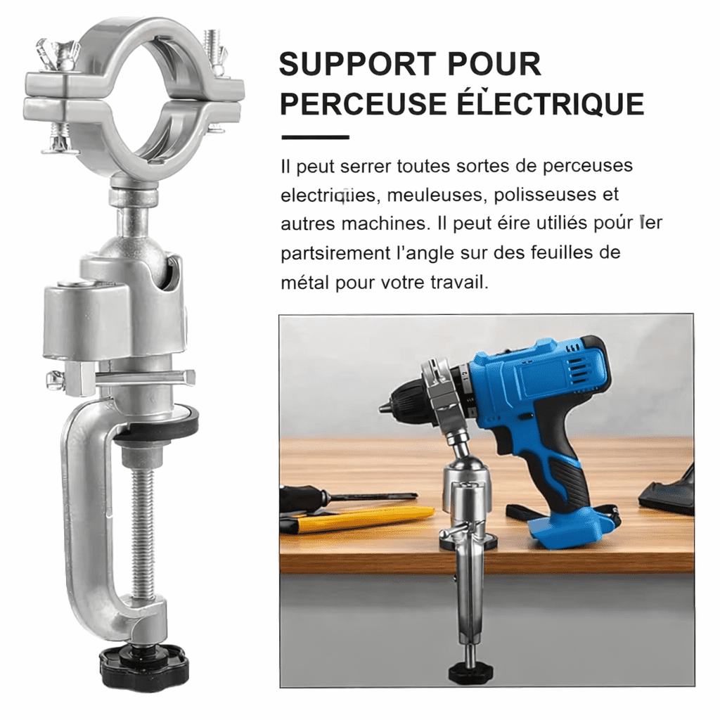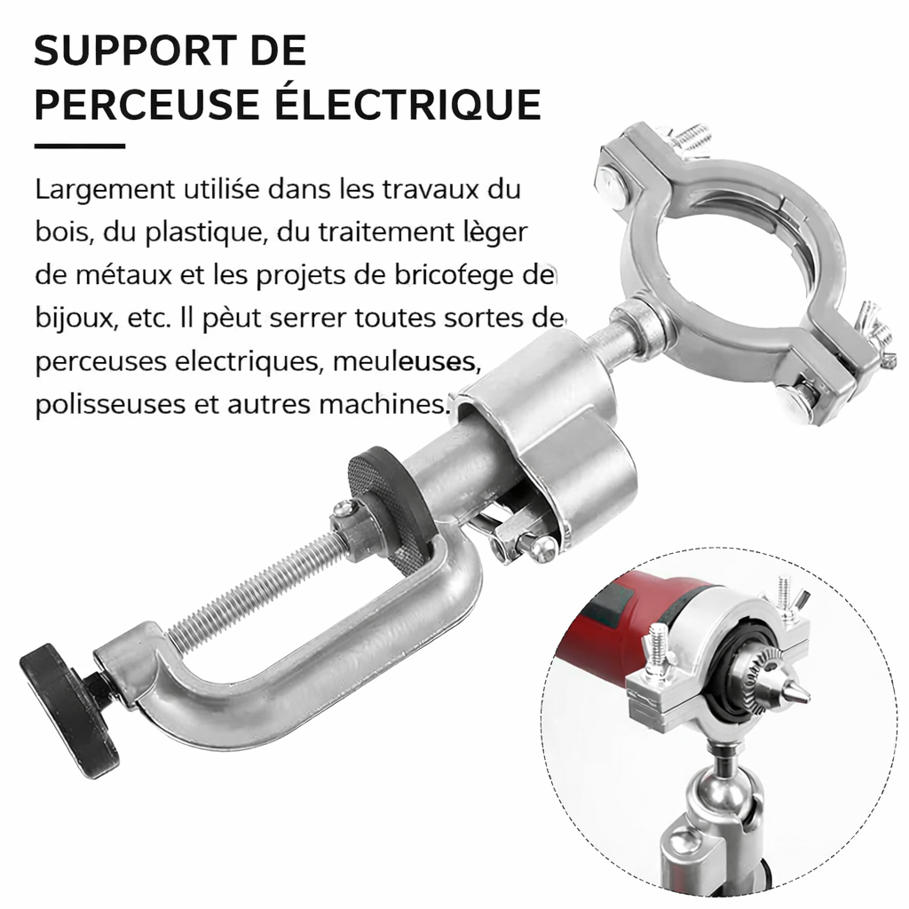 Le support universel permet de fixer différents outils comme des perceuses électriques, mini perceuses, meuleuses ou outils de précision, ce qui en fait un accessoire indispensable pour le travail du bois, du plastique, du métal léger ou les projets DIY et bijoux.